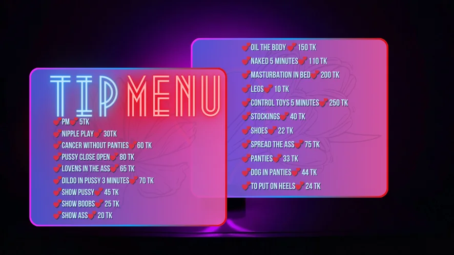 Erotic Dance, Topless, Doggy Style, Masturbation, Fingering, Cowgirl, Anal Toys, Dildo or Vibrator, Handjob, Creampie, Oil Show, Ass to Mouth, Squirt